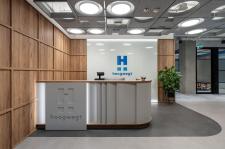 Jak podkreśla sam architekt, to właśnie projekt sufitów jest elementem, który zasługuje tu na szczególną uwagę. W strefie wejścia oraz w jednej z sal konferencyjnych znajdziemy akustyczny sufit wykonany na zamówienie przez firmę Nyquista. Prostopadłościenne elementy z materiału typu PET tworzą ciekawą kompozycję naprzemiennie ułożonych pudełek z wycięciami o różnych kształtach - litery „H" nawiązującej do logotypu firmy, kwadratów, okręgów z miejscem na oprawę oraz półkoli. W pomieszczeniach biurowych, w przestrzeniach typu open space oraz pozostałych salach spotkań z kolei zaprojektowano sufit również wykonywany według indywidulnego projektu, tym razem przez firmę Morrow Woods. Są to wyspy sufitowe z siatki cięto-ciągnionej lakierowanej na kolor niebieski oraz wyspy drugiego rodzaju z paneli PET. Obydwie wersje wysp wykończone są laminowaną listwą obwodową w kolorze drewnopodobnym Swiss Krono Dąb Pradawny - takim samym jak na ścianach czy części zabudów meblowych. Dla podkreślenia tych nietypowych elementów i wyciszenia tła strop wraz z instalacjami został pomalowany na kolor biały. Pomiędzy wyspami podwieszone zostały czarne oprawy liniowe w rozmiarze poszczególnych grup wspomnianych wysp.